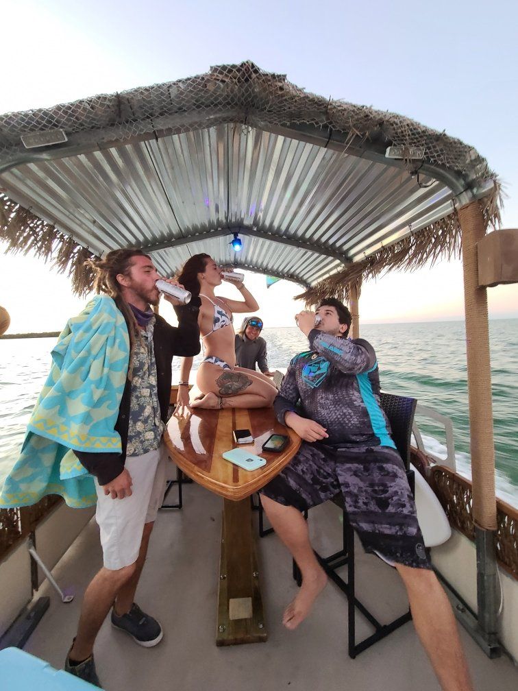Our A+ Captain is always ready to spot out wildlife, find the best anchor spot for you to enjoy the sandbar and help you make memories that last a lifetime. A custom Bluetooth Sound System ensures there is no competition to your music selection while our bench or stool seating guarantees maximum comfort. Enjoy the shade under our palapa to cool off while you rest your drink on our custom surfboard bar. Smaller kids and older adults will have no trouble getting in and out of the water with our huge 4 step ladder. Afterward, rinse off with our freshwater shower as we cruise back to shore.